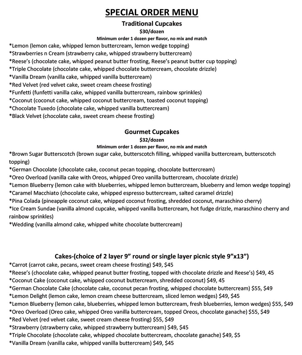 Introducing our Special Order Menu, where you can customize your baking experience with a variety of delicious options. From traditional cupcakes to gourmet cupcakes, standard cakes, cheesecakes, and pies, our menu offers a wide range of flavors and designs to suit any occasion.