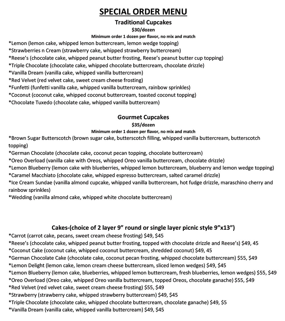 Introducing our Special Order Menu, where you can customize your baking experience with a variety of delicious options. From traditional cupcakes to gourmet cupcakes, standard cakes, cheesecakes, and pies, our menu offers a wide range of flavors and designs to suit any occasion.